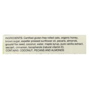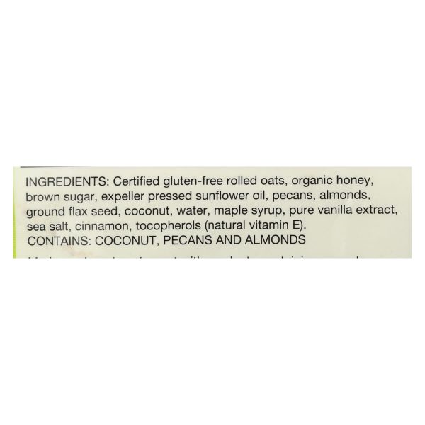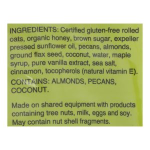 ingredients : certified gluten-free rolled oats;organic honey;brown sugar;expeller pressed sunflower oil;pecans;almonds;ground flax seed;coconut;water;maple syrup;pure vanilla extract;sea salt;cinnamon;tocopherols;natural vitamin e