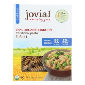 Jovial traditional einkorn fusilli is an artisan pasta that leaves you feeling satisfied without weighing down your digestion. Our certified usda organic einkorn wheat pasta provides 8 g. Of protein per serving with no saturated fat. Each einkorn fusilli comes in one 12 oz. Box and is certified kosher.