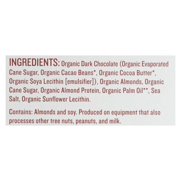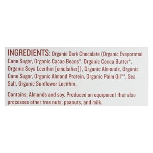 ingredients : organic dark chocolate (organic evaporated cane sugar, organic cacao beans*, organic cocoa butter*, organic soya lecithin [emulsifier]);organic almonds;organic cane sugar;organic almond protein;organic palm oil;sea salt;organic sunflower lecithin