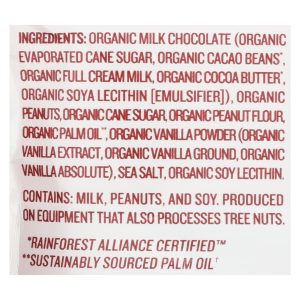 ingredients : organic milk chocolate (organic evaporated cane sugar, organic cacao beans*, organic full cream milk, organic cocoa butter*, organic soya lecithin [emulsifier]);organic peanuts;organic cane sugar;organic peanut flour;organic palm oil;organic vanilla powder (organic vanilla extract, organic vanilla ground, organic vanilla absolute);sea salt;organic soy lecithin