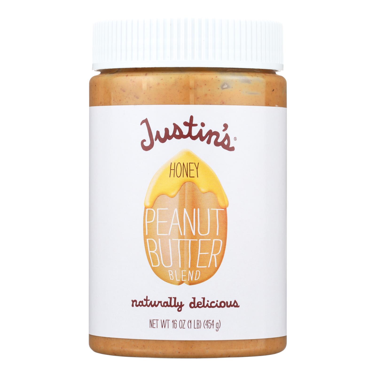 Justin’s honey peanut butter blend is made with naturally-delicious dry roasted peanuts and responsibly-sourced honey without any added sugar. Each 2 tbsp. Serving provides 7 g. Of protein, 2 g. Of fiber and 0 g. Trans fat. Our peanut butter blend comes in one 16 oz. Jar and is certified gluten-free.