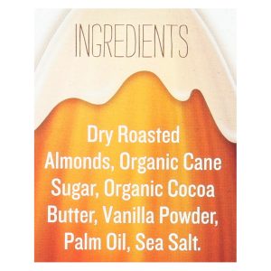 ingredients : dry roasted almonds;organic cane sugar;organic cocoa butter;vanilla powder;palm oil;sea salt