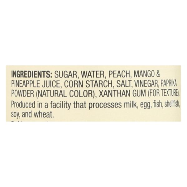 ingredients : sugar;water;peach;mango & pineapple juice;corn starch;salt;vinegar;paprika powder;natural color;xanthan gum;for texture