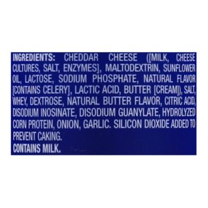 ingredients : cheddar cheese [(milk, cheese cultures, salt, enzymes), maltodextrin, sunflower oil, lactose, sodium phosphate, natural flavor [contains celery], lactic acid, butter (cream)], salt, whey, dextrose, natural butter flavor, citric acid, disodium inosinate, disodium guanylate, hydrolyzed corn protein, onion, garlic, silicone dioxide added to prevent caking.