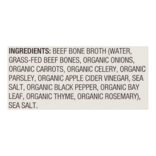 ingredients : beef bone broth (water, grass-fed beef bones, organic onions, organic carrots, organic celery, organic parsley, organic apple cider vinegar, sea salt, organic black pepper, organic bay leaf, organic thyme, organic rosemary);sea salt