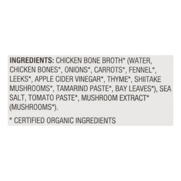 ingredients : chicken bone broth* (water, chicken bones, onions*, carrots*, fennel*, leeks*, apple cider vinegar*, thyme*, shiitake mushrooms*, tamarind paste*, bay leaves*);sea salt;tomato paste;mushroom extract* (mushrooms*)