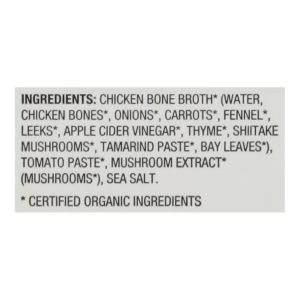 ingredients : chicken bone broth* (water, chicken bones*, onions*, carrots*, fennel*, leeks*, apple cider vinegar*, thyme*, shiitake mushrooms*, tamarind paste*, bay leaves*);tomato paste;mushroom extract*(mushrooms*);sea salt