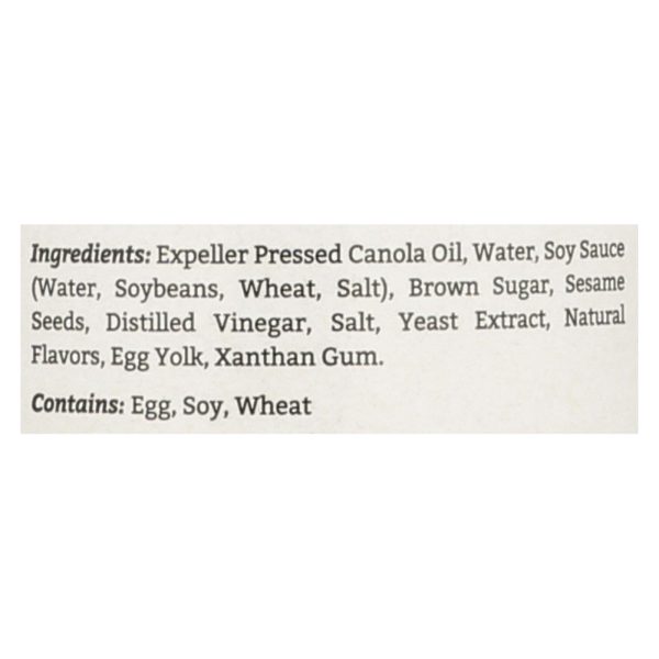 ingredients : expeller pressed canola oil;water;soy sauce (water, soybeans, wheat, salt);brown sugar;sesame seeds;distilled vinegar;salt;yeast extract;natural flavors;egg yolk;xanthan gum