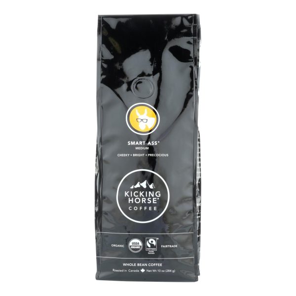 Kicking horse coffee smart ass whole bean coffee is a bright and chocolaty medium roast blend. Our coffee is sourced from africa, central america and south america. These are certified fairtrade arabica beans that are roasted in the rocky mountains. Each 10 oz. Bag of whole bean coffee is certified usda organic.