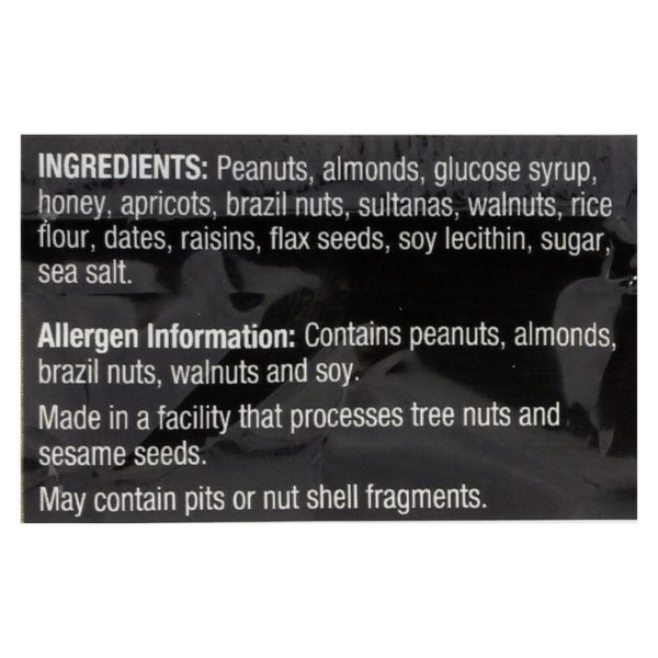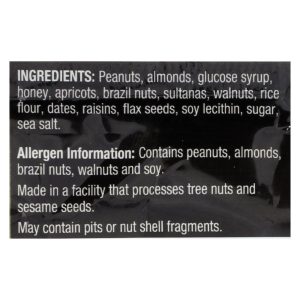 ingredients : peanuts;almonds;glucose syrup;honey;apricots;brazil nuts;sultanas;walnuts;rice flour;dates;raisins;flax seeds;soy lecithin;sugar;sea salt