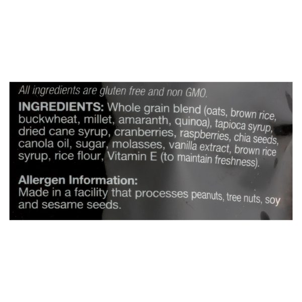 ingredients : oats;tapioca syrup;brown rice;cane sugar;cranberries;millet;raspberries;chia seeds;buckwheat;canola oil;amaranth;molasses;natural flavor;quinoa;brown rice syrup;sea salt;vitamin e;tocopherols to maintain freshness
