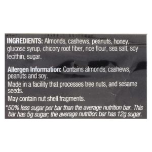 ingredients : almonds;cashews;peanuts;honey;glucose syrup;chicory root fiber;rice flour;sea salt;soy lecithin;sugar