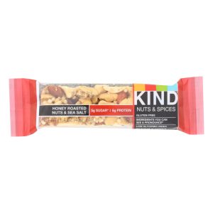 Kind honey roasted nuts & sea salt nuts and spices bars are a treat for the individual on the go. With only 5g of sugar and 15g of far per bar and with 6g of protein, our snack bars are the kind thing to do for your body, your taste buds, and your world. Our snack bar is also low sodium and completely kosher, as well as completely gluten-free and gmo-free. With ingredients that you can see and pronounce, you can be sure you can trust and taste kind snacks. Included is one 1.4 oz. Packet of kind honey roasted nuts & sea salt nuts and spices bars.