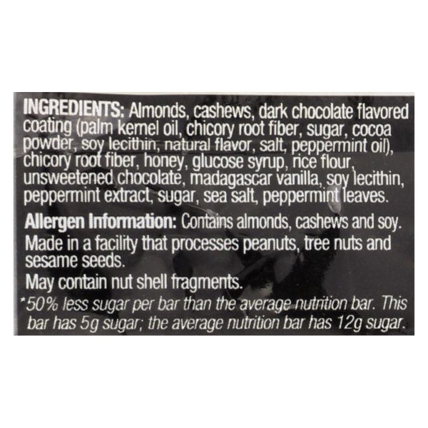 ingredients : almonds;cashews;dark chocolate flavored coating;palm kernal oil;chicory root fiber;sugar;cocoa powder;soy lecithin;natural flavor;salt;peppermint oil;honey;glucose syrup;rice flour;unsweetened chocolate;madagascar vanilla;peppermint extract;sea salt;peppermint leaves