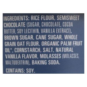 ingredients : rice flour;semisweet chocolate;sugar;chocolate;cocoa butter;soy lecithin;vanilla extract;brown sugar;cane sugar;gluten-free whole grain oat flour;organic palm fruit oil;cornstarch;salt;natural vanilla flavor;molasses;maltodextrin;baking soda
