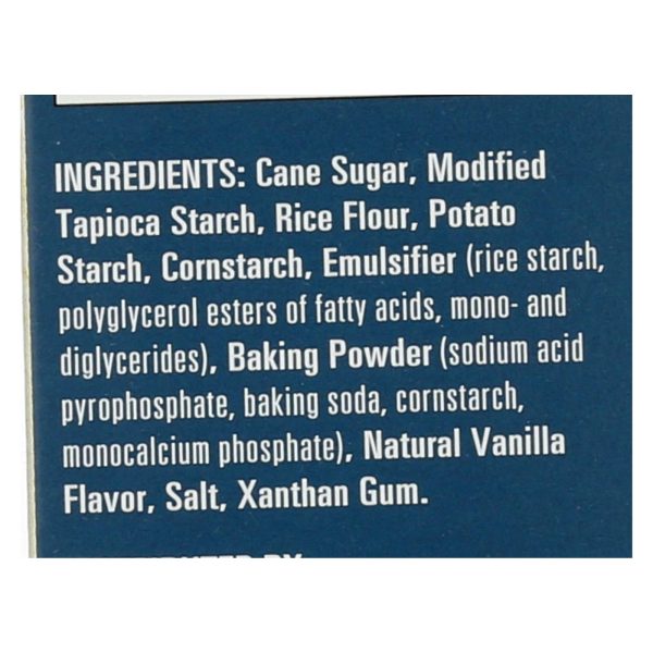 ingredients : cane sugar;tapioca starch;rice flour;corn starch;emulsifier (rice starch, polyglycerol esters of fatty acids, mono- and diglycerides);baking powder (sodium acid pyrophosphate, baking soda, corn starch, monocalcium phosphate);salt;natural vanilla flavor;xanthan gum