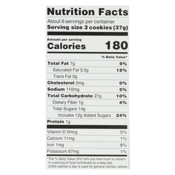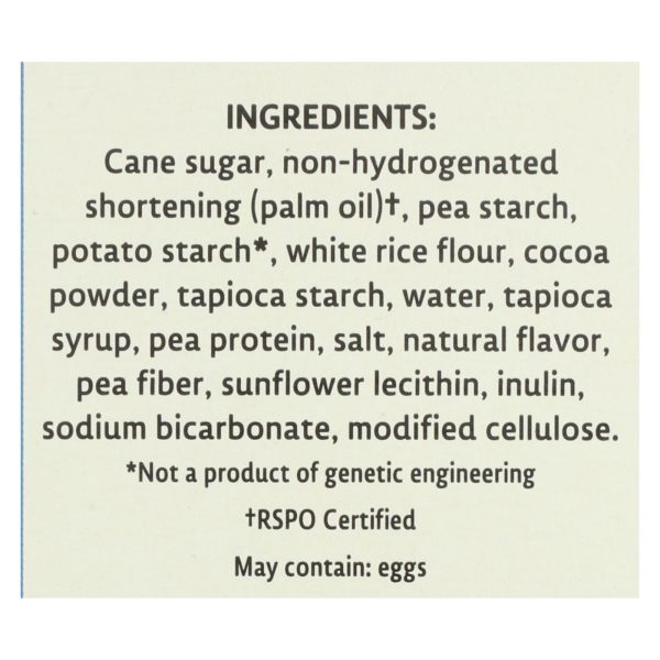 ingredients : cane sugar;non-hydrogenated shortening;palm oil;†;pea starch;potato starch;white rice flour;cocoa powder;tapioca starch;water;tapioca syrup;pea protein;salt;natural flavor;pea fiber;sunflower lecithin;inulin;sodium bicarbonate;modified cellulose