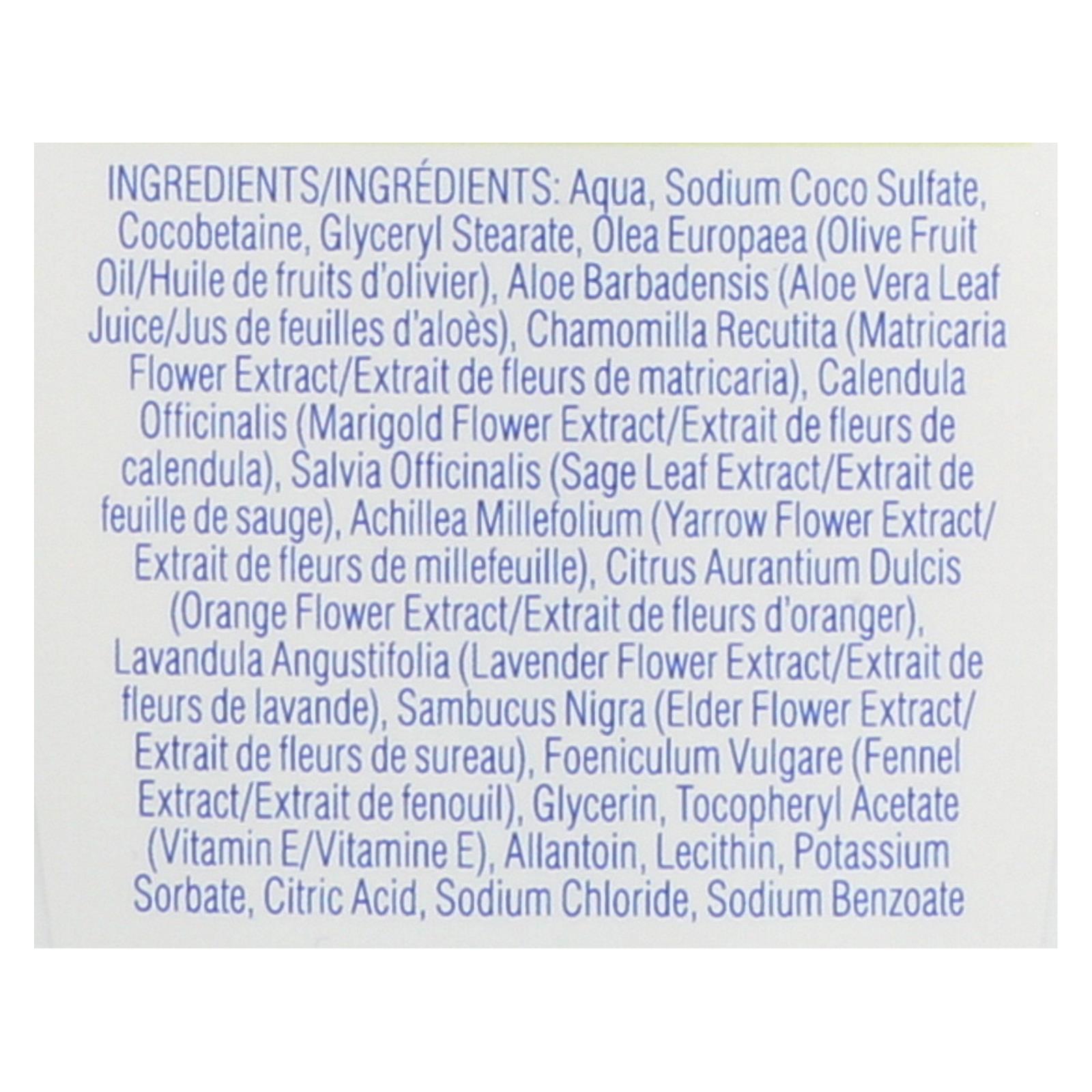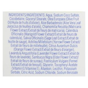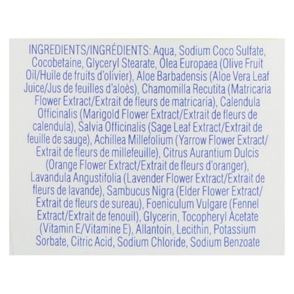 ingredients : aqua;sodium coco sulfate;cocobetaine;glyceryl stearate;olea europaea;olive fruit oil;aloe barbadensis;aloe vera leaf juice;chamomilla recutita;matricaria flower extract;calendula officinalis;marigold flower extract;salvia officinalis;sage leaf extract;achillea millefolium;yarrow flower extract;citrus aurantium dulcis;orange flower extract;lavandula angustifolia;lavender flower extract;sambucus nigra;elder flower extract;foeniculum vulgare;fennel extract;glycerin;tocopheryl acetate;vitamin e;alla