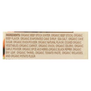 ingredients : organic beef stock;water;organic beef flavor;organic evaporated cane syrup;sea salt;organic cane sugar;organic onion powder;organic natural flavor;cooked organic vegetables;organic carrot;organic onion;organic celery;organic garlic powder;organic spice and herbs;organic black pepper;organic bay leaf;organic thyme;organic tomato paste;organic molasses;and organic potato flour