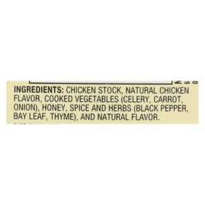 ingredients : chicken stock;natural chicken flavor;cooked vegetables;celery;carrot;onion;honey;spice and herbs;black pepper;bay leaf;thyme;and natural flavor
