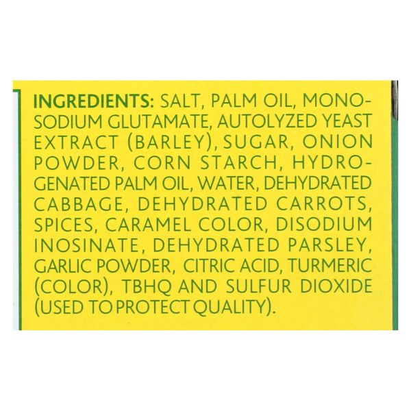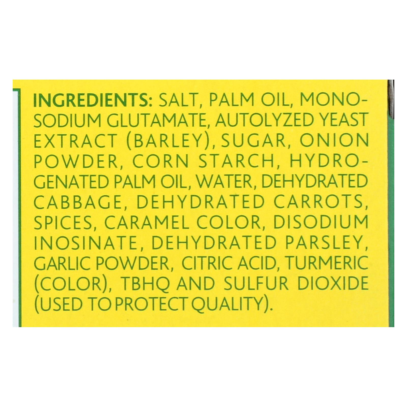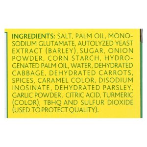 ingredients : salt;palm oil;monosodium glutamate;autolyzed yeast extract;barley;sugar;onion powder;corn starch;hydrogenated palm oil;water;dehydrated cabbage;dehydrated carrots;spices;caramel color;disodium inosinate;dehydrated parsley;garlic powder;citric acid;turmeric;color;tbhq and sulfur dioxide;used to protect quality