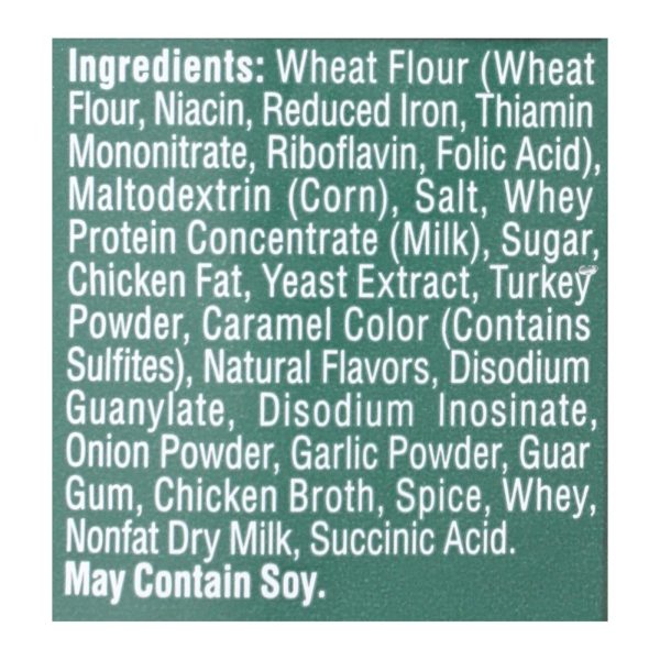 ingredients : wheat flour (wheat flour, niacin, reduced iron, thiamin mononitrate, riboflavin, folic acid);maltodextrin (corn);salt;whey protein concentrate (milk);sugar;chicken fat;yeast extract;turkey powder;caramel color (contains sulfites);natural flavors;disodium guanylate;disodium inosinate;onion powder;garlic powder;guar gum;chicken broth;spice;whey;nonfat dry milk;succinic acid