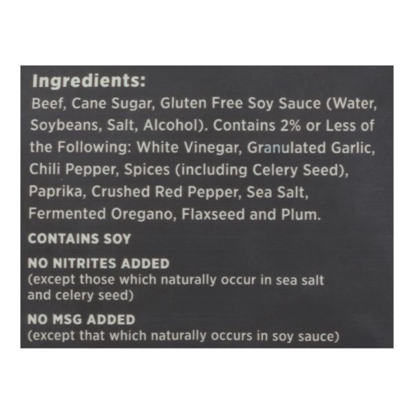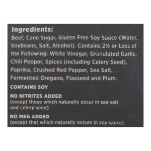ingredients : grass-fed beef;cane sugar;gluten free soy sauce (water, soybeans, salt, alcohol);contains 2% or less of the following: white vinegar, granulated garlic, chili pepper, spices (including celery seed), paprika, crushed red pepper, sea salt, fermented oregano, flaxseed and plum