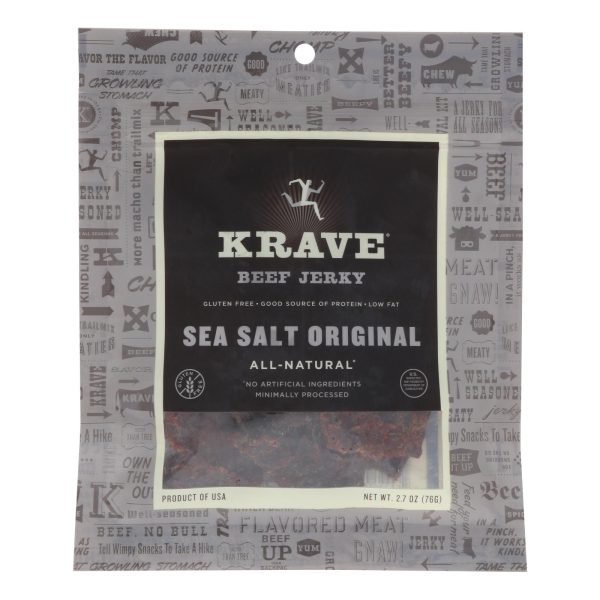 Krave’s sea salt beef jerky is an all-natural snack that is both low-fat and a good source of protein. Each pouch contains tender beef slices, sugar, soy sauce, honey and sea salt. For only 100 calories per 1 oz. Serving, you get 9 g. Of protein. Our jerky contains no artificial ingredients, msg (except naturally occuring in soy sauce) or nitrates/nitrites (except those naturally occuring in sea salt). See nutrition facts panel for allergens.