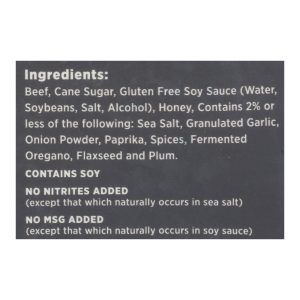 ingredients : grass-fed beef;cane sugar;gluten free soy sauce (water, soybeans, salt, alcohol);honey;contains 2% or less of the following: sea salt, granulated garlic, onion powder, paprika, spices, fermented oregano, flaxseed and plum