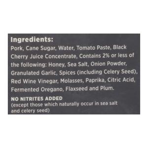 ingredients : pork;cane sugar;water;tomato paste;black cherry juice concentrate;contains 2% or less of the following: honey, sea salt, onion powder, granulated garlic, spices (including celery seed), red wine vinegar, molasses, paprika, citric acid, fermented oregano, flaxseed and plum