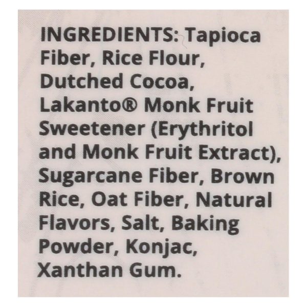 ingredients : tapioca fiber;non-gmo lakanto monkfruit sweetener (erythritol and monk fruit extract);dutched cocoa;chick pea flour;sugarcane fiber;acacia gum;oat fiber;sea salt;baking powder;guar gum;natural flavors