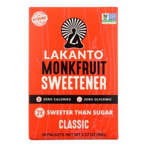 Lakanto’s classic monkfruit sweetener is a perfect 1:1 white sugar substitute made with erythritol and monk fruit extract harvested according to traditional and environmental methods. Our sweetener is kosher check certified, non-gmo project verified, has zero calories and no additives. Monk fruit sweetener is vegan friendly, gluten-free and cooks, bakes and tastes just like sugar. Included is one bag with 30 lakanto classic monkfruit sweetener stick packs.