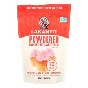 Lakanto powdered monkfruit sweetener with erythritol is a sugar-free 2:1 replacement for powdered sugar. With double the sweetness of regular powdered sugar, and the same texture as powdered sugar, this product is ideal for use on powder-dusted desserts as well as for making frostings and icing. Monk fruit has zero effect on blood sugar or insulin levels, so it’s great for blood sugar and weight management. Monkfruit sweetener with erythritol comes in a 1 lb. Pouch.