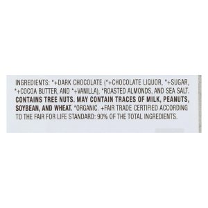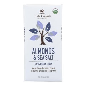 Lake champlain chocolate almonds & sea salt dark chocolate bar uses 72% cocoa chocolate for a slightly bitter, salty and sweet treat with the crunch of roasted almonds. This 3 oz. Chocolate is certified organic and contains conscientiously sourced ingredients that conform to the fair for life standards of fair trade. Each bar provides about 2.5 servings of iron- and fiber-rich chocolate.