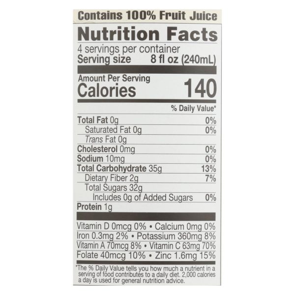 Lakewood organic mango 100% juice blend provides a unique sweet and tart taste with its blend of mangoes, lemons and apples. Pour some into a smoothie to up the wow factor or use this as a base for a marinade for chicken or pork. The 32 fl. Oz. Bottle contains four servings of 8 fl. Oz. And 120 calories that you need to keep in the fridge after opening and shake well before serving.