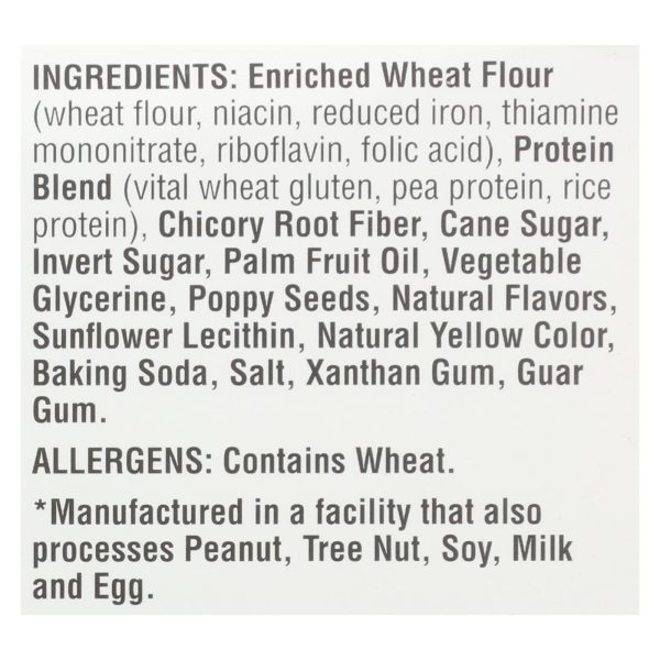 ingredients : enriched wheat flour (wheat flour, niacin, reduced iron, thiamine mononitrate, riboflavin, folic acid);protein blend (vital wheat gluten, pea protein, rice protein);inulin;cane sugar;invert sugar;palm fruit oil;vegetable glycerine;poppy seeds;natural flavors;sunflower lecithin;natural yellow color;baking soda;salt;xanthan gum;guar gum