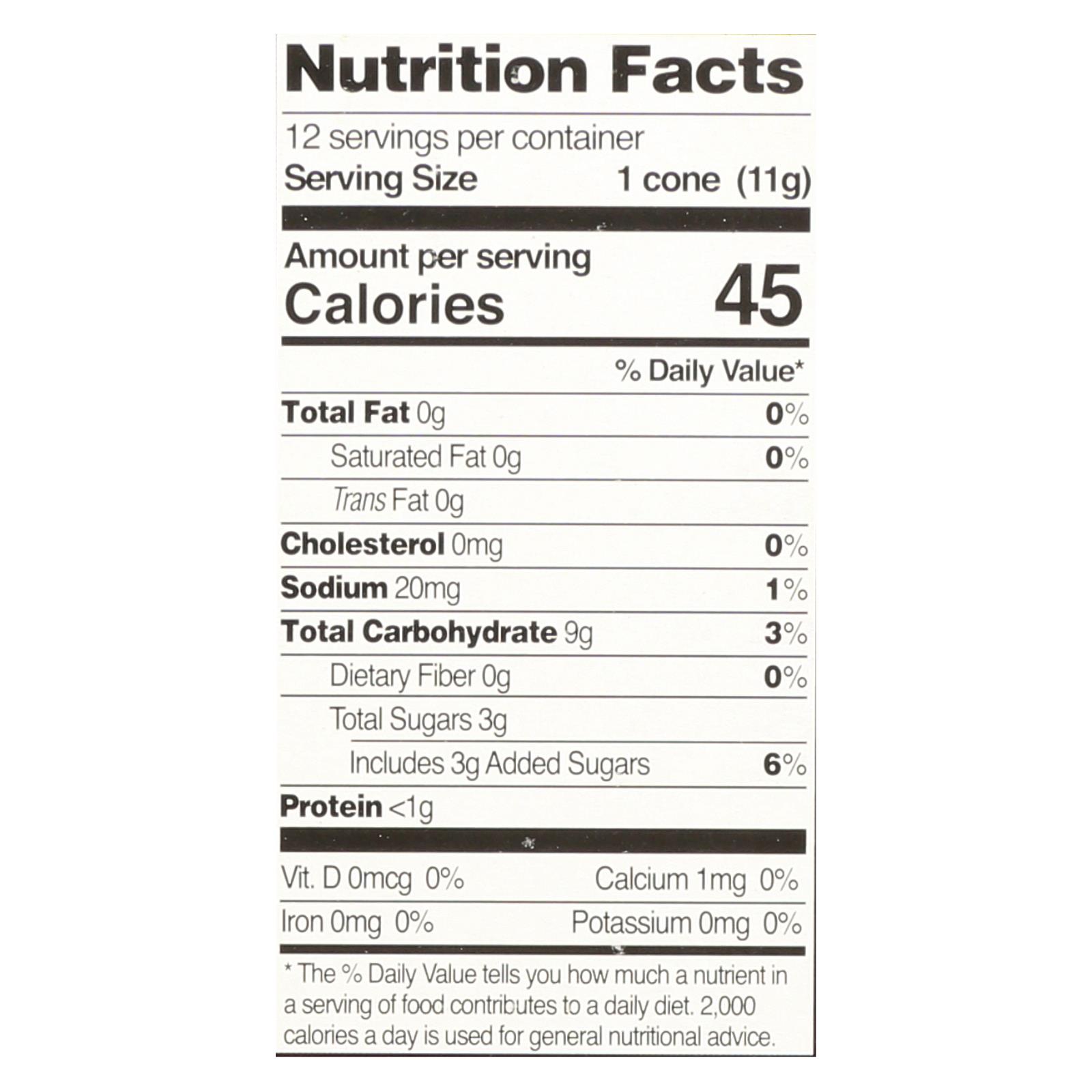 Let’s do… organic sugar cones are our traditional style rolled cones that are vegan friendly and usda and qai certified organic. They have 0 g. Of trans fat and are free of hydrogenated oils. Our orthodox union kosher certified sugar cones come in a 4.6 oz. Box that has 12 traditional style rolled cones.
