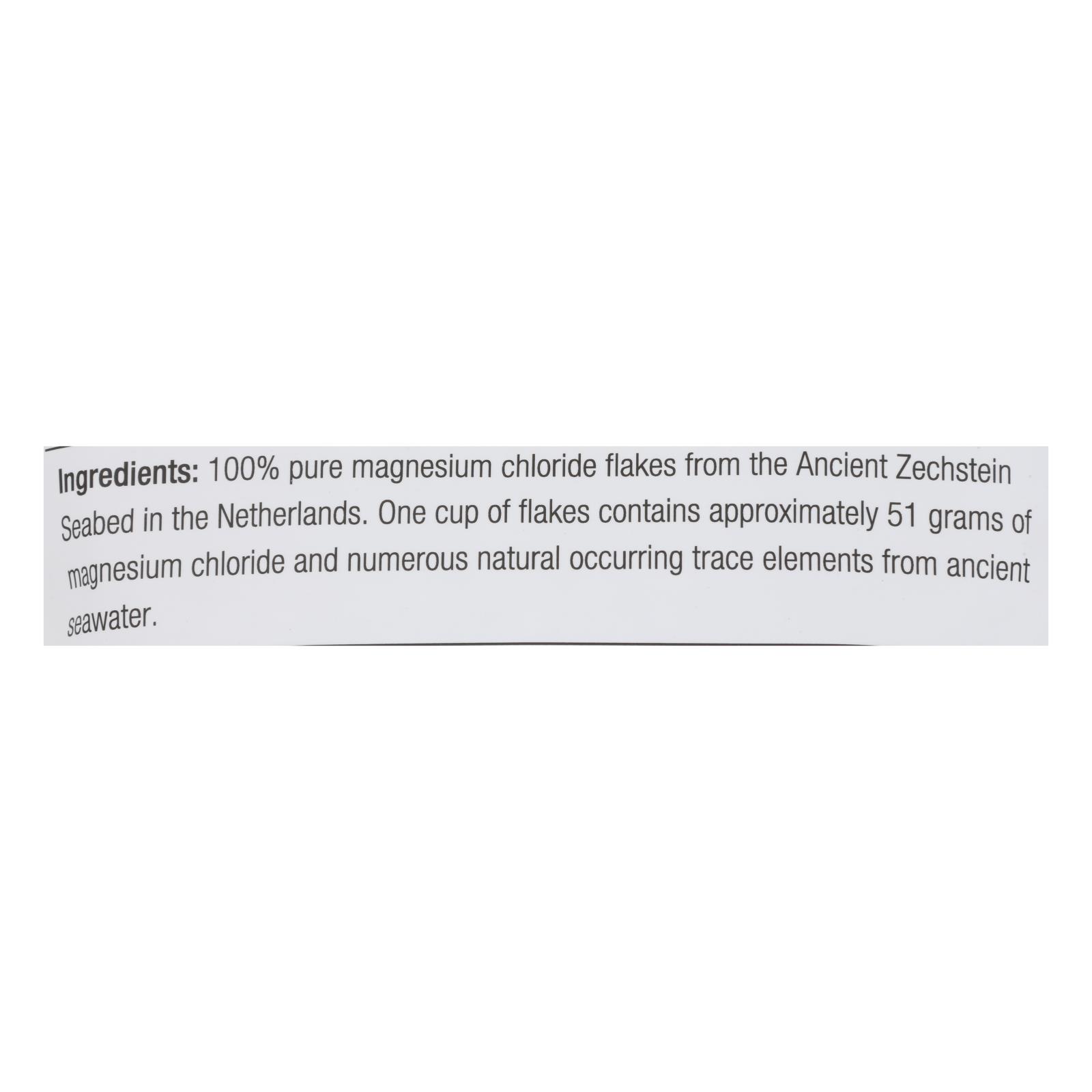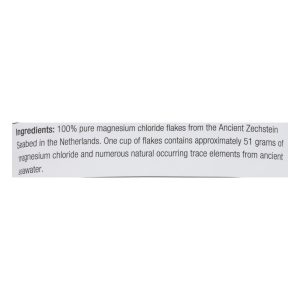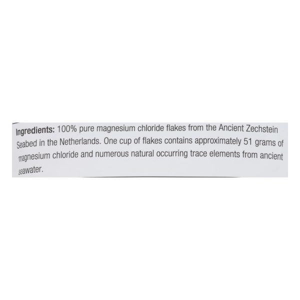 ingredients : 100% pure magnesium chloride flakes from the ancient zechstein seabed in the netherlands. One cup of flakes contains approximately 51 grams of magnesium chloride and numerous natural occurring trace elements from ancient seawater
