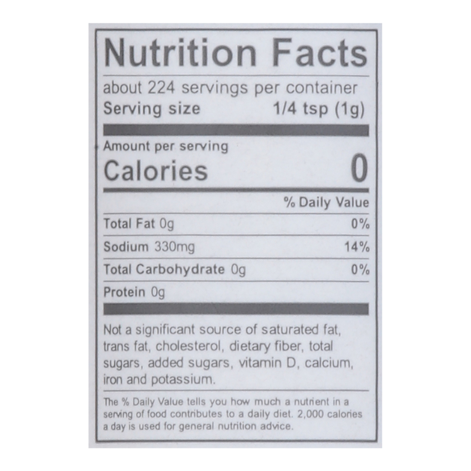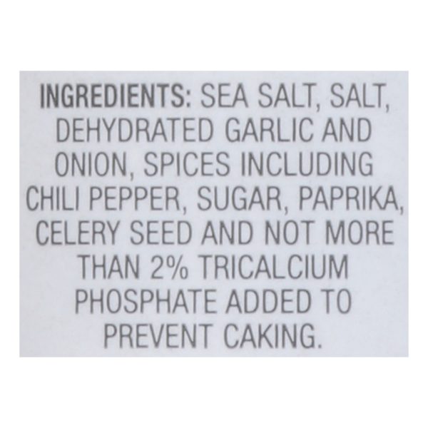 ingredients : sea salt;salt;dehydrated garlic and onion;spices including chili pepper;sugar;paprika;celery seed and not more than 2% tricalcium phosphate added to prevent caking