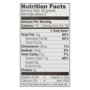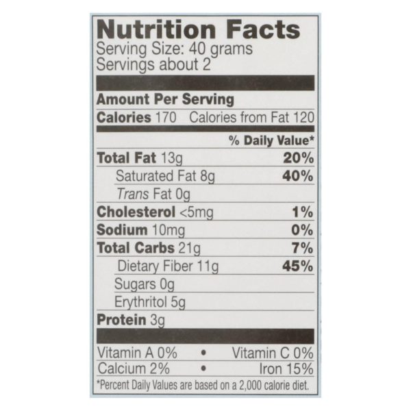 ingredients : unsweetened cocoa;inulin;dextrin ;erythritol ;cocoa butter;organic crispy brown rice (organic brown rice, organic rice syrup, sea salt);milk fat (rbst free);organic soy lecithin;stevia extract;vanilla extract