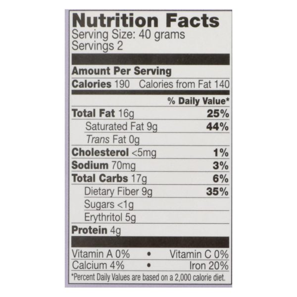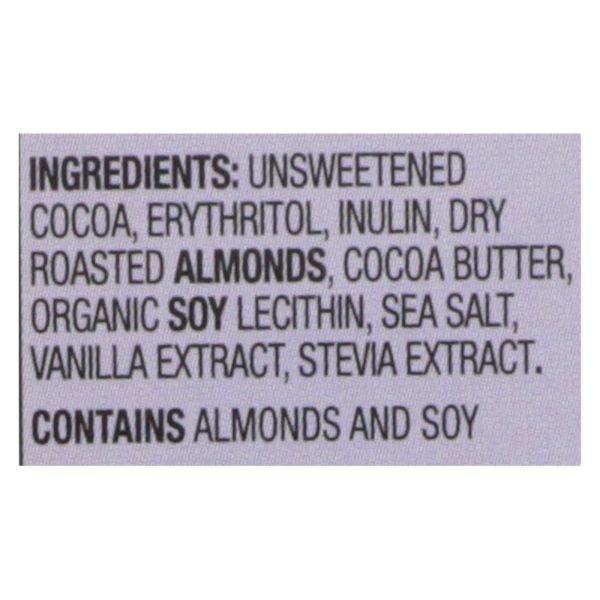 ingredients : unsweetened cocoa;erythritol;inulin;dry roasted almonds;cocoa butter;organic soy lecithin;sea salt;vanilla extract;stevia extract