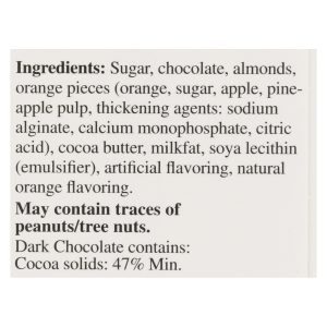 ingredients : sugar;chocolate;almonds;orange pieces;orange;apple;pineapple pulp;thickening agents: sodium alginate;calcium monophosphate;citric acid;cocoa butter;milkfat;soya lecithin;emulsifier;artificial flavoring;natural orange flavoring