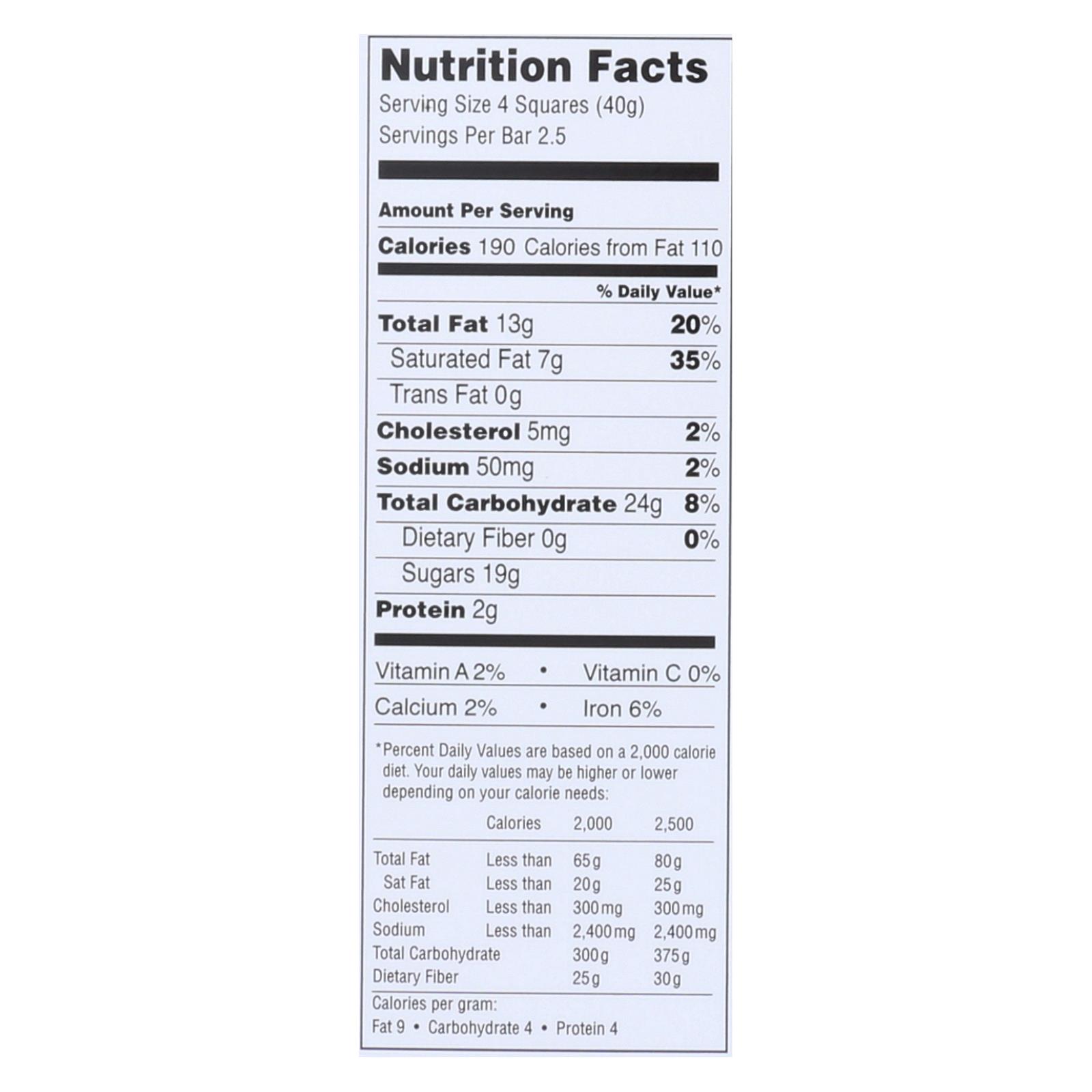 Lindt bar excellence dark chocolate sea salt offers a savory treat. The luxury ingredients include chocolate, cocoa butter, sugar and sea salt. With 4 squares of dark chocolate as a single serving size, you’ll get about 2.5 servings to this 3.5 oz. Lindt bar. See the nutrition facts panel for allergens.