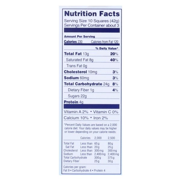 Lindt classic recipes milk bar is a creamy, smooth treat. The ingredients include cocoa butter, chocolate, sugar, milk and skim milk. Each 10 square serving contains 230 calories, and you’ll get about 3 servings in each 4.4 oz. Lindt classic recipes milk bar. See the nutrition facts panel for allergens.