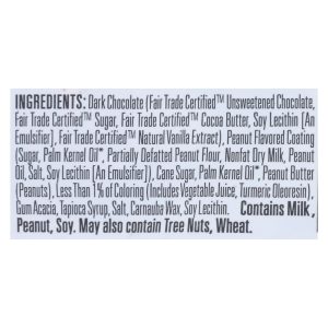ingredients : dark chocolate (fair trade certified unsweetened chocolate, fair trade certified sugar, fair trade certified cocoa butter, soy lecithin [an emulsifier], fair trade certified natural vanilla extract);peanut flavored coating (sugar, palm kernel oil, partially defatted peanut flour, nonfat dry milk, peanut oil, salt, soy lecithin [an emulsifier]);sugar;palm kernel oil;peanut butter (peanuts);less than 1% of tapioca syrup;coloring (includes vegetable juice, turmeric oleoresin);salt;gum acacia;ca