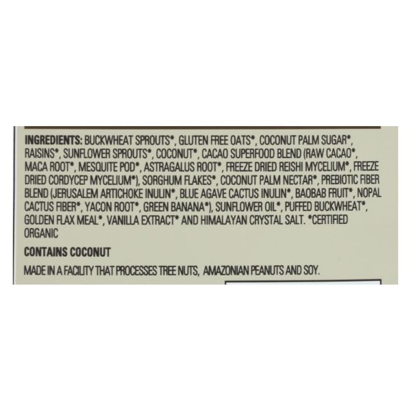 ingredients : buckwheat sprouts;gluten free oats;coconut palm sugar;raisins;sunflower sprouts;coconut;cacao superfood blend;raw cacao;maca root;mesquite pod;astragalus root;freeze dried reishi mycelium;freeze dried cordycep mycelium;sorghum rakes;coconut palm nectar;prebiotic fiber blend;jerusalem artichoke inulin;blue agave cactus inulin;baobab fruit;nopal cactus fiber;yacon root;green banana;sunflower oil;puffed buckwheat;golden flax meal;vanilla extract* and himalayan crystal salt