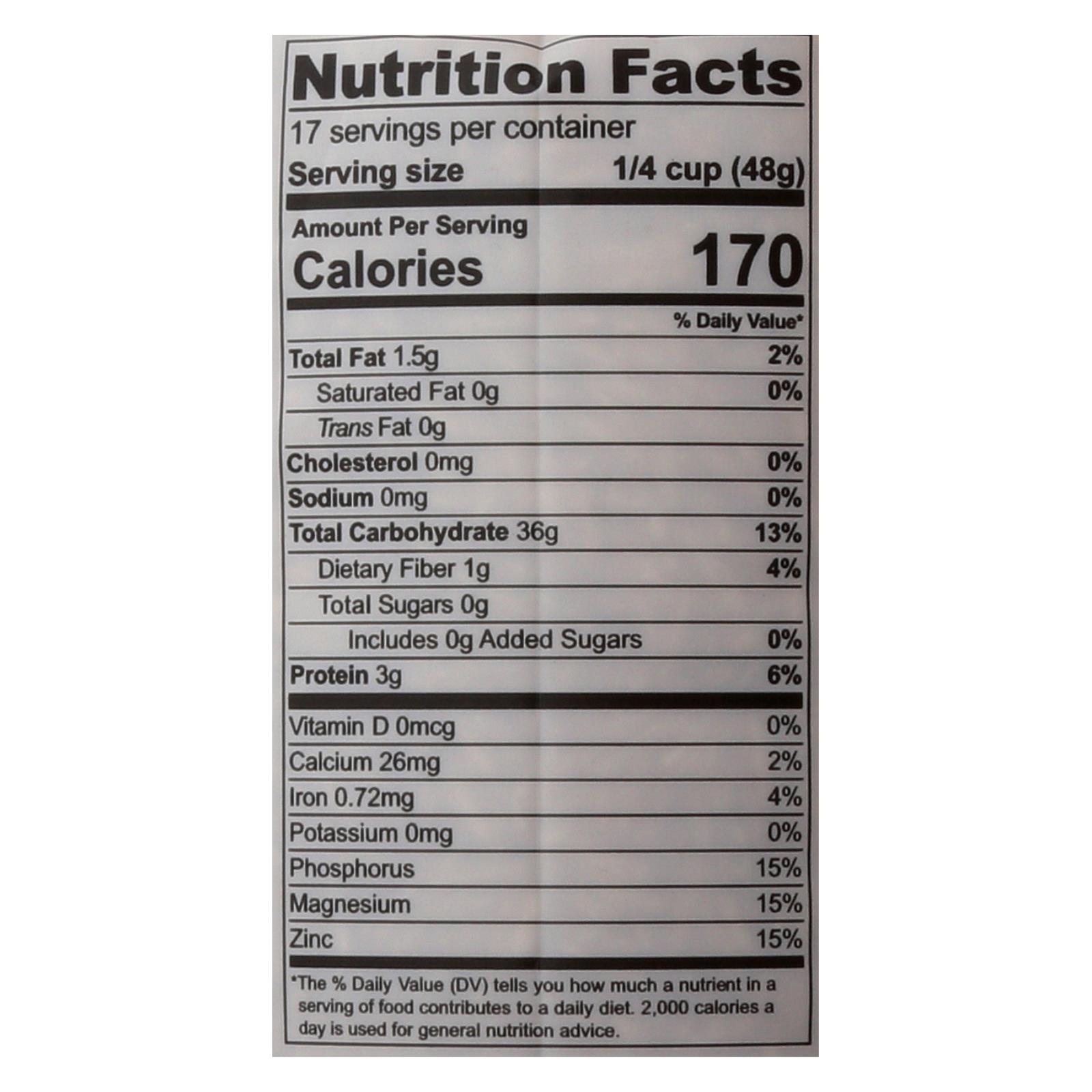 Lotus foods organic rice, brown basmati is a natural, non-gmo whole grain. Free from any additives or other substances, lotus foods organic rice, brown basmati is pure and nutrient rich. With 50% less water and 90% less seed, lotus foods yields three times the amount of rice as other brands. This product is gluten-free, kosher and organic. Each bag of lotus foods organic rice, brown basmati weighs 30 oz. With 17 servings per bag and 170 calories per serving. Store in a cool, dry place. See nutrition facts panel for allergens.