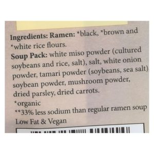ingredients : ramen: *black rice flour, *brown rice flour, *white rice flour;soup pack: white miso powder (soybeans, rice, salt), salt, soybean powder, tamari powder (soybeans, rice, salt), mushroom powder, onion powder dried carrot, dried parsley, dried scallion