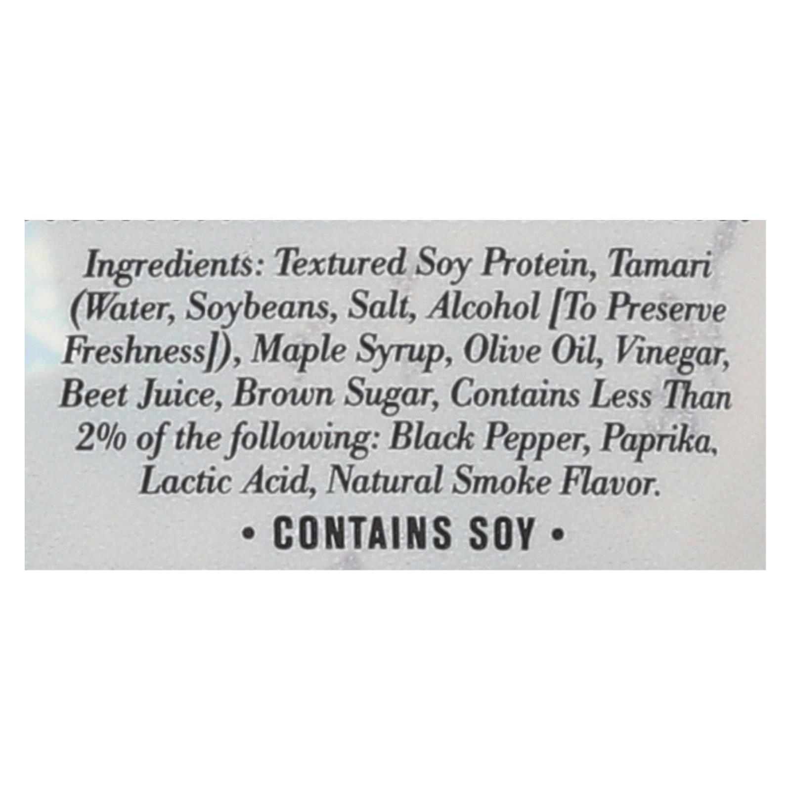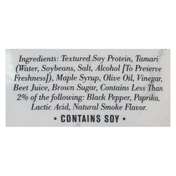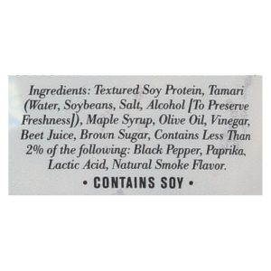 ingredients : textured soy protein;whole bean;tamari;water;soybeans;salt;alcohol [to preserve freshness];maple syrup;olive oil;vinegar;beet juice;vegan brown sugar;contains less than 2% of the following: vegan sourced lactic acid;natural smoke flavors