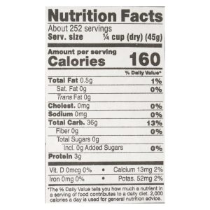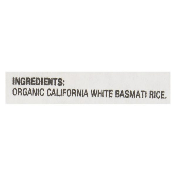 Lundberg family farms white basmati rice, grown in california, offers a delightful and healthy addition to your meals. A perfect accompaniment to recipes when potatoes just won’t do. Basmati is a food you can enjoy and feel good about eating. This delicately flavored product is a delicious, organic long grain rice and provides the additional advantage of being kosher and gluten free. Pure organic california basmati rice. Each bag of lundberg family farms white basmati rice contains about 25 pounds of product, and about 252 servings. There are 160 calories per serving. See nutrition panel for allergens. Enjoy this very tasty complement to a healthy diet.